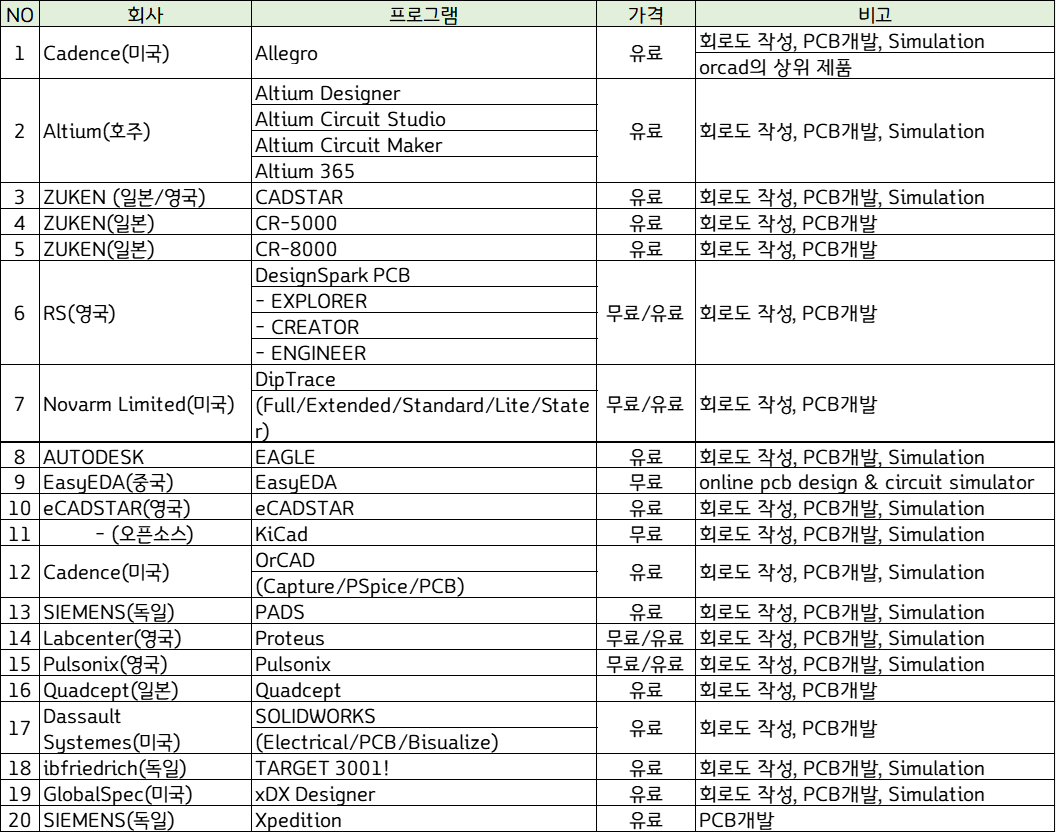 - 위의 표에서 확인하였듯이 회로설계, PCB설계, 시뮬레이션 프로그램이 너무나도 많습니다. 그렇다면 어떤 프로그램을 선택해야 할까요?
