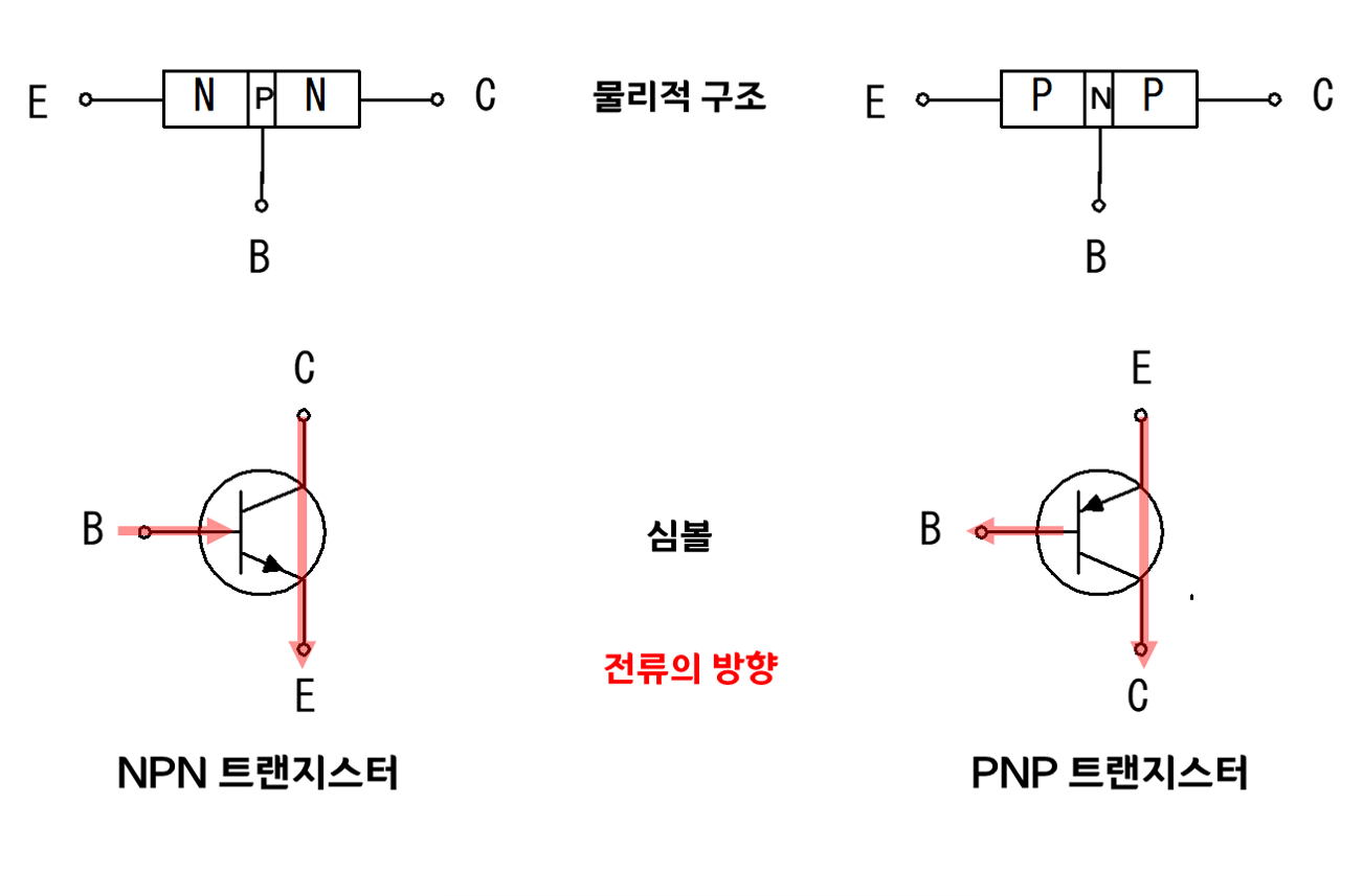 지난 포스팅에서 다뤘던 다이오드 기억나시나요? 다이오드는 N형 반도체와 P형 반도체를 접합해서 만들었죠? 트랜지스트는 N형반도체+P형반도체+N형반도체를 접합해서 만들거나 P형반도체+N형반도체+P형반도체를 접합해서 만듭니다. 어떻게 접합했느냐에 따라서 NPN 트랜지스터 또는 PNP트랜지스터가 있습니다. 트랜지스터는 위 그림과 같이 3개의 전극, 각각 에미터(E:Emitter), 베이스(B:BASE), 콜렉터(C:Collector)를 가지고 있습니다. 에미터와 콜렉터 사이에 얇은 베이스 층이 존재하며, 베이스-에미터 간에 전류를 흘려 보내면 콜렉터-에미터 간의 전류를 제어할 수 있으며 전류 증폭 효과가 있습니다. N형 반도체와 P형 반도체의 결합에 따라 NPN형과 PNP형이 있으며 전류 흐름 방향이 반대됩니다. 트랜지스터로서의 특성은 NPN형과 PNP형에서 동일합니다.