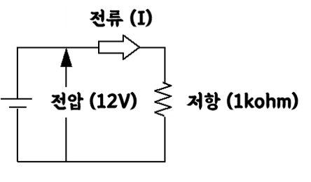 칩 저항을 예를 들어 설명드리겠습니다. 아래와 같은 회로도가 있다면 저항에 걸리는 전력은 W = V² / R =12²V / 1kohm = 0.144W 입니다. 그렇다면 0.144W보다 높은 전력의 저항을 선정해야 합니다. 칩저항을 기준으로 한다면 3216사이즈 (0.5W)의 칩저항을 선정하면 됩니다. 칩저항의 사이즈별 전력값은 아래에서 설명드리겠습니다.